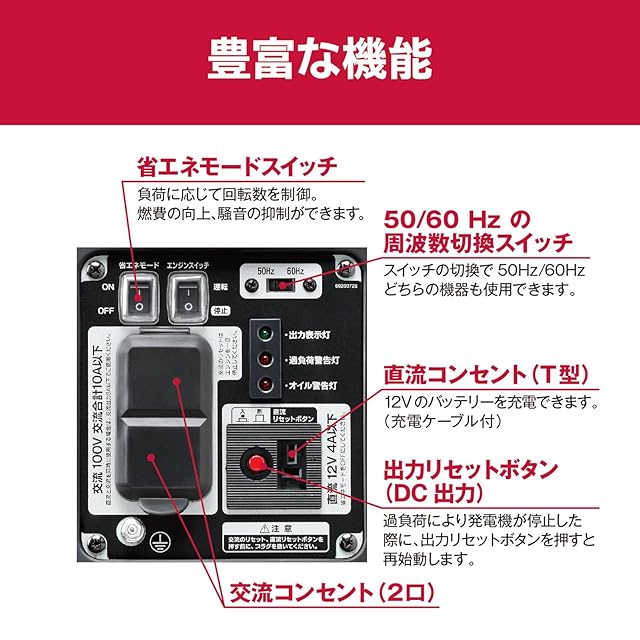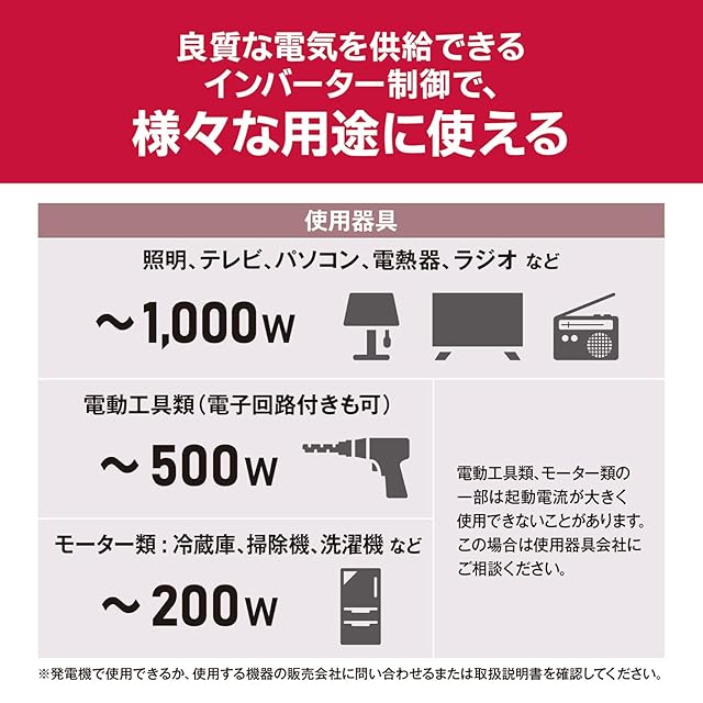 ●発電機形式:多極界磁回転型。●定格電圧(100V(交流)・12V(直流))・定格出力1000W。