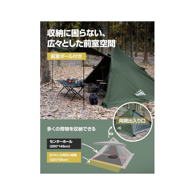 ✅【インナーテント付き・快適な睡眠環境を】普通のワンポールテント比べ、当社のテントはメッシュ加工のインナーテントも付属し、寝る時間には虫の侵入を防ぐことができます。また、底部のシートは耐水圧3000mmの防水加工・防カビを施し、夏でも利用できます。前後のドアを開けると、インナーテントを利用し、テント内の空気が新鮮で快適な状態を維持できます。更に、ロータイプのコットが使用できるよう床面サイズを少し広めの220x100cmに設計し、アウトドアでも快適な睡眠環境を構築します。✅【通気窓と煙突口付き・よい換気システム装備】燃えにくい素材が使われているため、このTCテントはストーブの煙突用ホールが付いて、室内で煙突薪ストーブと組み合わせて使用が可能、寒い時期でも暖かく過ごせます。また、二つの通気窓と後部の開閉可能のドアが付き、鮮やかな外気を取り込め、通気性に優れ、夏でも蒸れにくく、快適な環境を維持できます。 ※一酸化炭素中毒にならないことをするものではありません。 ※必ず想定される事故(火災)などの対策は万全にしてください。