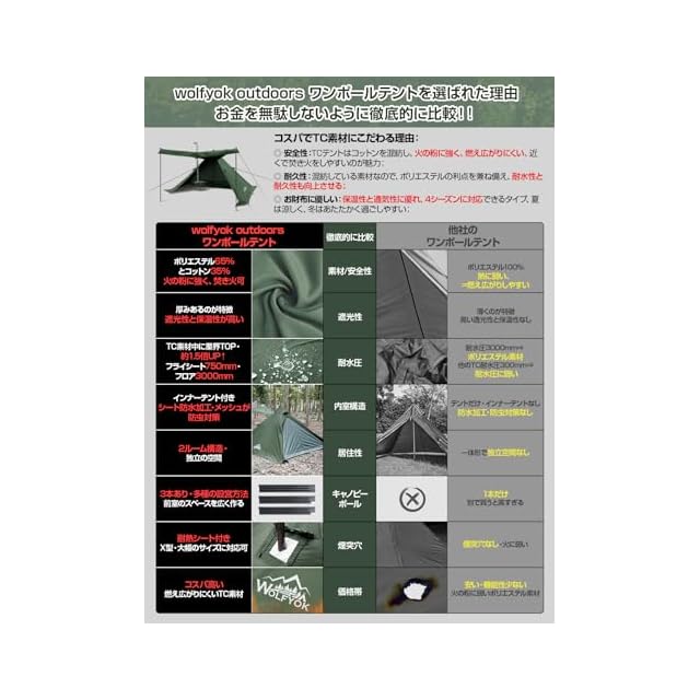 ✅【難燃性に強い・魅力的なTCテント登場】 wolfyok outdoors のワンポールTCテントは65%ポリエステルと35%コットンの利点を兼ね備えた混紡生地を採用し、冬でも結露を防止できます。単純のポリエステル生地と比較して、火の粉に強く、燃え広がりにくい、近くで焚き火をしやすいのが魅力です。また、遮光性・透湿性・通気性が高いのもポイント。更に、コットンに比べて軽量で扱いやすく、耐久性に優れているのが特徴です。夏は涼しく、冬はあたたかく過ごしやすいので、通年使えるワンポールテントを求めている方におすすめです。※燃えない素材ではありませんのでテント下での焚き火はおやめください。
