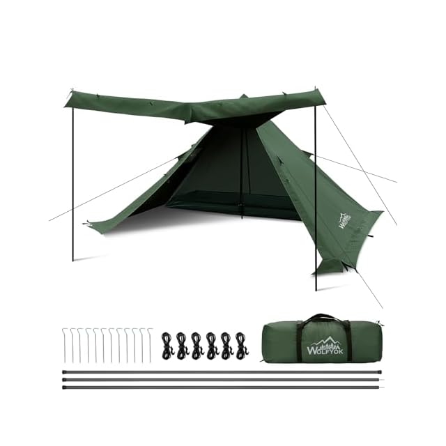 ワンポールテント ソロ TC ポリコットン 【二本前室ポール付き&1.2m²広い前室】難燃性 遮光性 wolfyok outdoors 簡単設営 焚き火可 煙突穴付き 二重層構造 1人用 通気 防風 ティピーテント ソロキャンプ用 アウトドア 【国内ブランド】