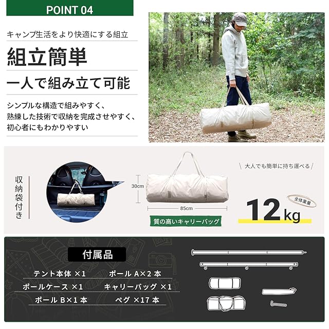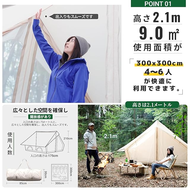 【製品仕様】使用人数: 3~6人、展開サイズ: W300xL300xH185cm、入口の高さ: 175cm、収納サイズ: W85xH30xD35cm、付属品:キャリーバッグ、ポール各種、ペグ17本