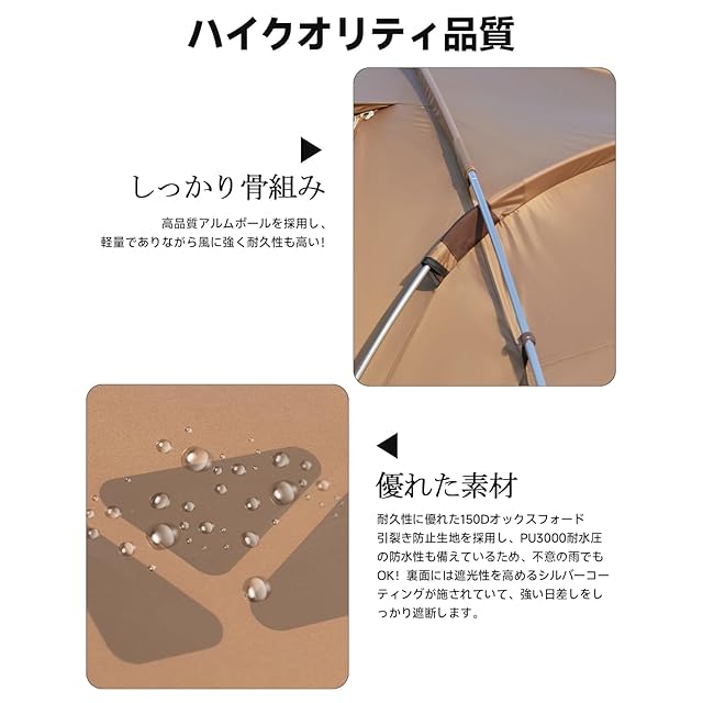 【防風防水なテント】 150Dオックスフォード生地(耐水圧PU3000mm)を採用したフライで急な雨でもOK!裏面には遮光性を高めるシルバーコーティングが施されていて、強い日差しをしっかり遮断します。高品質アルミポールで耐久性があり、骨組みがしっかりしていて、安定感があり強風にも強く、悪天候の中でも快適に過ごすことができます。