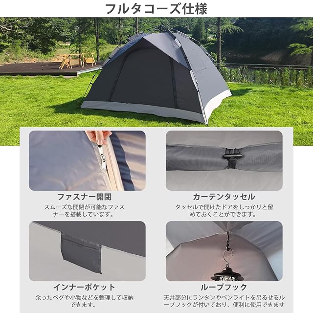 ✅【通気性抜群と快適なスペース】テント ワンタッチは左右2ヶ所のメッシュ窓と、ダブルメッシュ構造のドアを採用します。フロント扉には虫除けネットが設けられて、微細な網目が虫の侵入をしっかり防ぎつつ、視認性と通気性を両立します。内外どちらからでもスムーズに開閉でき、ロープでまとめて固定することも可能です。内部にはランタンや小物を吊るせるリングフックと収納袋が装備されています。小物を整理して場所を取らないようにできるので、4人用テント内を整然と保てます。