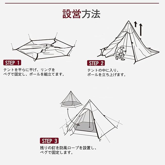 ■キャンプ場で注目度No1のビッグワンポールテント ■本体外側にペグを打ち込み、1本のポールを立てるだけの超シンプル構造 ■最大4人が就寝可能な床面積がありながら、必要なパーツが少ないため、収納時はコンパクトになります ■スタイリッシュな外観は、キャンプ場やフェス会場などでも、他のテントとは一線を画すファッション性をアピールします ■広々としたテント内部 ■大人4人がゆったり寝ることができる床面積を確保。2~4人程度であれば広々と使用できます ■アルミY型ペグ ■コンパクトサイズ ■ベンチレーター ■テント上部のベンチレーターにより、テント内部の熱や湿気を排出 ■テント内部の快適環境を保ちます