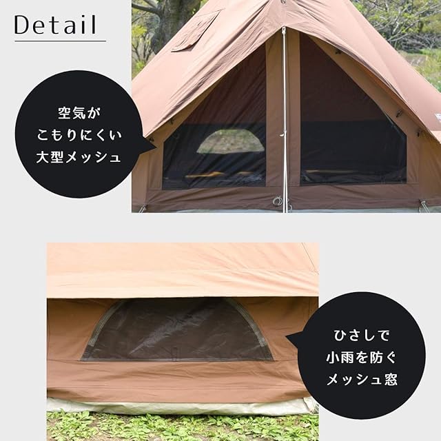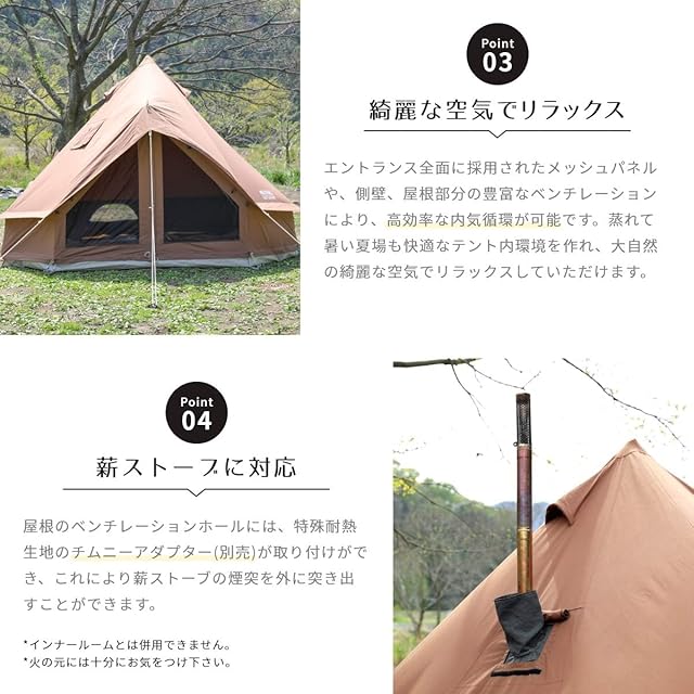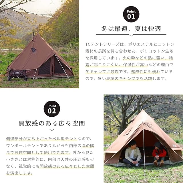 【火の粉に強いポリエステルコットン生地のテント】 ポリエステルコットン生地を使用したTCテントの最新作です。火の粉に強いポリコットン生地を採用し、快適な空間を提供します。シリーズカラーにはダークブラウンを採用し、煤汚れが目立ちにくく、強い日差しを遮ることができます。取り外し式のベンチレーター部も搭載し、さらなる使い勝手を追求しています。