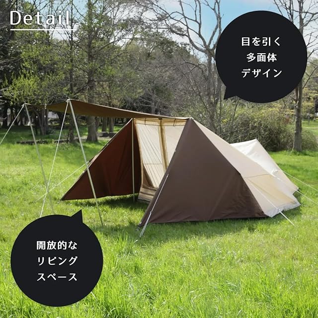 【洗練されたデザイン】このツールームテントは2ルームスタイルをこのアレンジした多面体デザインは、現代建築のような美しさを持ち、周囲の注目を集めます。広々とした居住性と、エントランス部分でのアウトドア活動を両立しました。