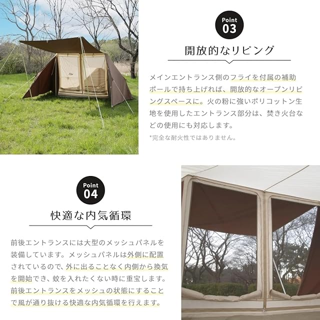 【開放感のあるリビング】メインエントランス側のフライを補助ボールで持ち上げると、開放的なオープンリビングスペースに変身します。焚き火台などの使用にも対応するポリコットン生地を使用したエントランス部分は、高い耐火性と優れた耐熱性があり、多目的に使用できます。