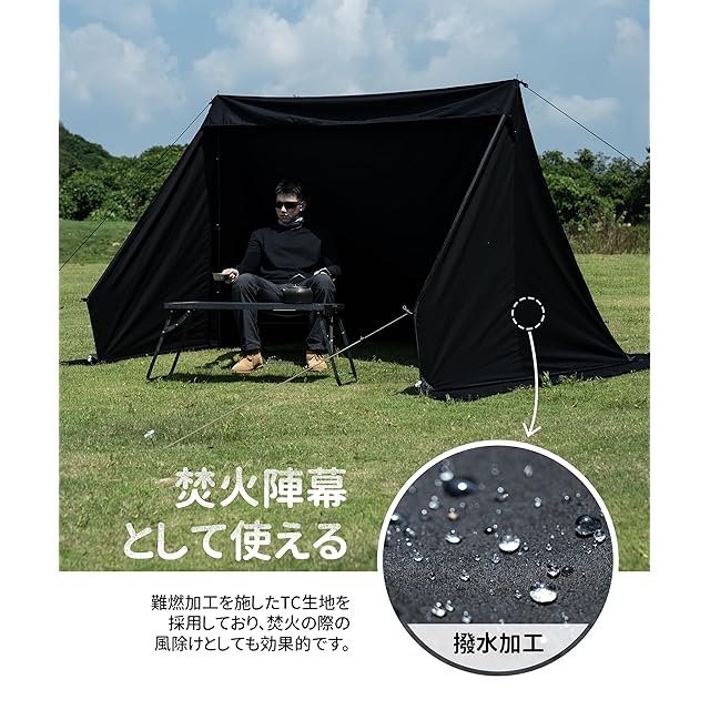 【焚き火用陣幕として】単体で焚き火陣幕として使うことができます。サイズは250CM X 198CM X160CMで、大型目隠しや焚き火風除けなどに活躍できます。固定に必要なのは160cmのポール2本とガイロープ4本だけで、安定性と隠蔽性を兼ね備えています。プライバシーを守りながら風を防ぎます。本製品にポールは含まれておりませんのでご注意ください
