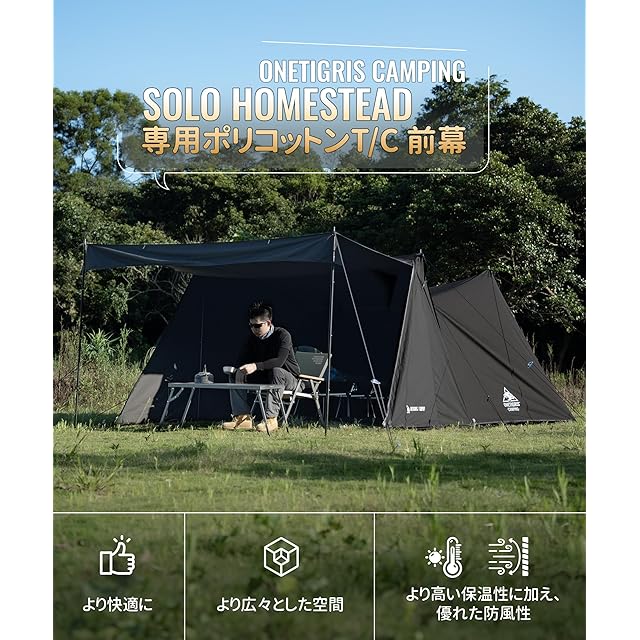 OneTigris SOLO Dark Shadow テント前幕 T/C 大型 焚き火陣幕 SOLO HOMESTEAD黒TCテントに対応 スペース拡大 遮光 難燃 スノースカート付き ファスナーフロントドア