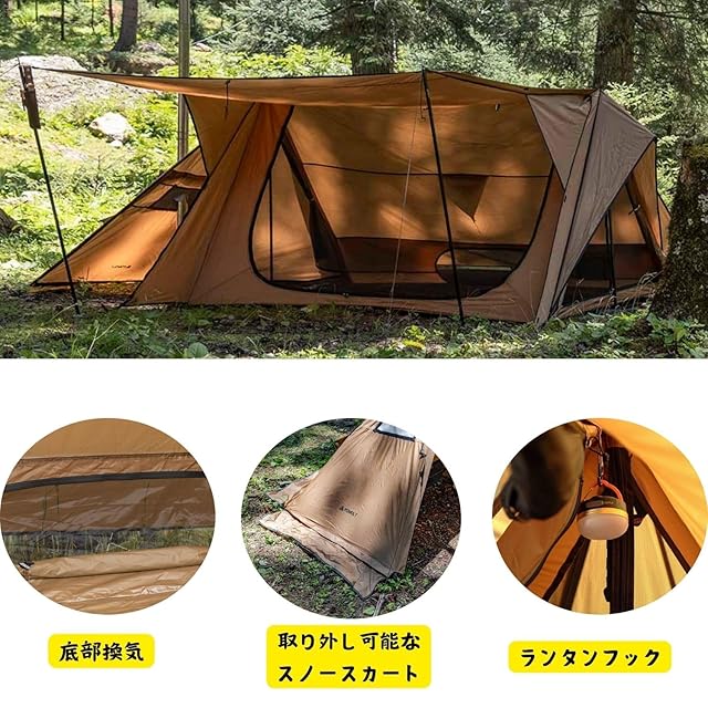 【前室・スカート装備で防風・防寒】前室とスノースカート付き設計で、冷気や風の侵入を防ぎます。雨の日や雪の日にも安心して使用可能、キャンプ中の快適さを大幅にアップ!
