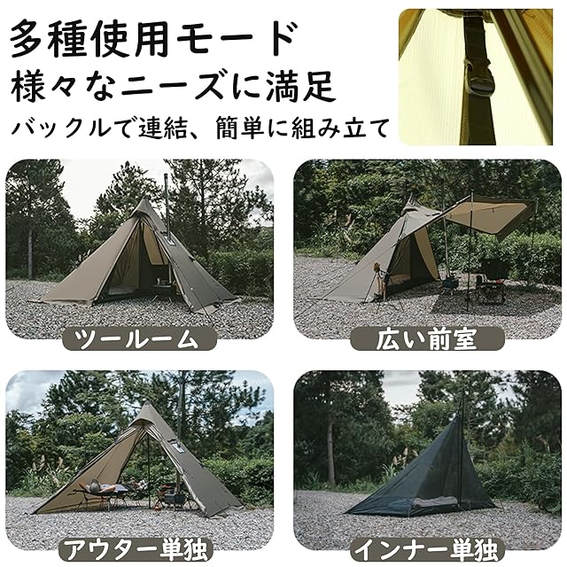 【多様な組み立て方法が可能】このキャンプテントのインナーとアウターはそれぞれ単独で組み立てることができます。アウターを単独で組み立てる場合、前後のダブルドアで出入りが自由で、通気性も良好、遮光・遮熱効果もあります。 インナーを単独で組み立てると、通気性が良く、虫の侵入を防ぎ、快適に休むことができます。インナーとアウターを一緒に組み立てることで、ツールームテントになり、防風効果とプライバシーを提供し、アウター底部にはスノースカートが付いており、さらなる防風性と保温性を高めます。薪ストーブとの組み合わせにより、冬でも暖かく過ごせます。また、追加のテントポールを使用することで、広い前室を作ることができます。(追加のテントポールは別途購入が必要です。)開放感があり、日よけとしても使用でき、自然の景色を楽しむことができます。