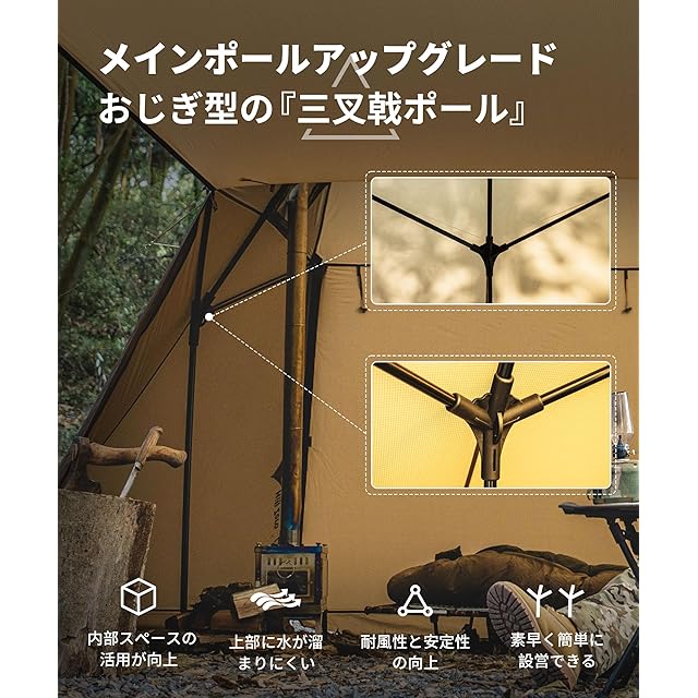 前後室付きパップテント:2つの入り口がある独特の6面六角形デザイン、ドアはすべて開いて出入りできます。復古風軍幕での視覚効果UP、テントポールを使用してキャノピーとしてスペースを有効活用できます。 ソロキャンプから家族キャンプに最適なテント前後室を広く使用することができます。この1台でゆったりキャンプを楽しめる初心者にも適したテントです。 テント内室両側には荷物や靴を置く場としてとても便利です。雨が降っても十分な安心感が得られます。