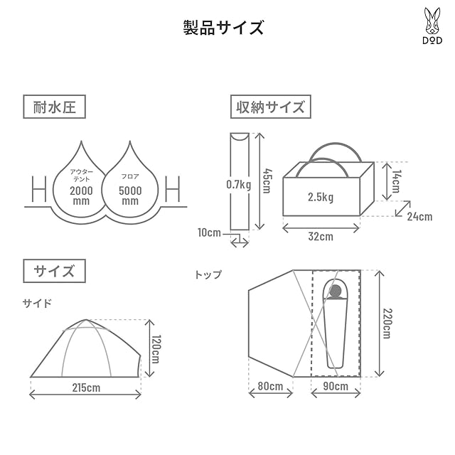 耐水圧:テント:2,000mm、フロア:5,000mm