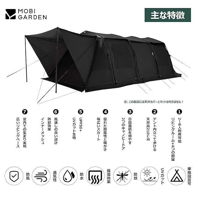 商品名:MOBI GARDEN トンネルテント 大型 5-8人用 インナーテント1個付き【天井カバーとグランドシート付きません】2層構造 耐水圧3000mm UPF50+ 防雨 防風 四面ドア アウトドアキャンピン 自立式 大型 通気 コンパクト ハイキング 防災 簡単設営