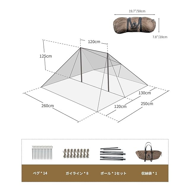 【付属品】OneTigris PLATOON テント * 1、ペグ * 14 、ガイライン * 8、ポール * 1セット、収納袋 * 1。商品到着後、すぐにご使用にならない場合でも、一度商品の状態をご確認ください。商品に不具合がある場合や、使用上ご不明の点がありましたら、御遠慮なく、是非弊社までご連絡くださいませ
