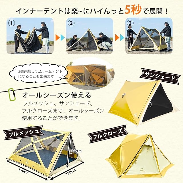 とにかく簡単に設営撤収!!初めての人でも楽にバインバイーっンと開いて、ベースはあっという間に完成、 折り紙スタイルなテント。 フルメッシュ、サンシェード、フルクローズ、サイドを開閉してパップテントスタイルまで、 ハイスペック・オールシーズン仕様、ソロでもカップルでもファミリーでも!幅広く使えるサイズで撤収も超楽々!! 2張以上あれば連結も出来て拡張もどんどんできます。パタパタっと広げて、両サイドの輪っかをバイ~ンっと引っ張るだけのインナーテントは約5秒で展開!フルメッシュインナーテントのみでビーチでも活躍!サンシェードシートを付けて日差しをカット!真夏の浜辺や公園でも簡単に立てれて大活躍!スカート(冷気侵入防止)が付いたフライシートは寒い時期でもバッチリ対応。 【メーカー希望小売価格】59,800円(税込)
