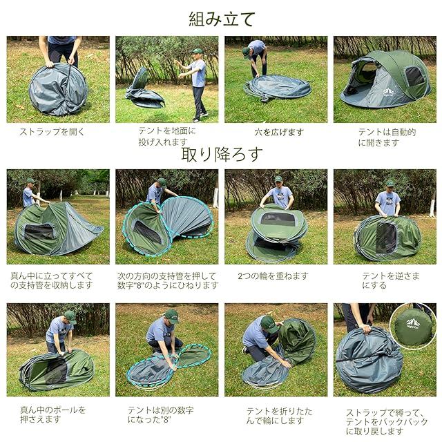 【アップグレードされたポップアップテント、簡単に折り返し】テントを地面に投げ、ポールを広げると3秒ですぐに開きます。折り返しは従来のポップアップキャンプテントよりも簡単で、8番のような簡単な設営テントを2回を繰り返して折り返します。