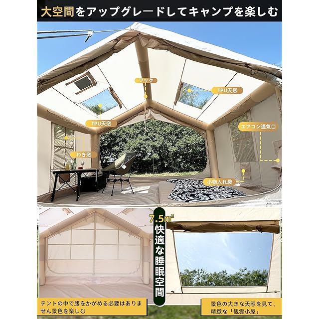 【空気注入5分完成|一人でも簡単設営】二重層バルブ設計。パイプに空気を入れるだけで柱が自動立ち上がり(※過膨張注意)、骨組み不要で5分以内に完成。