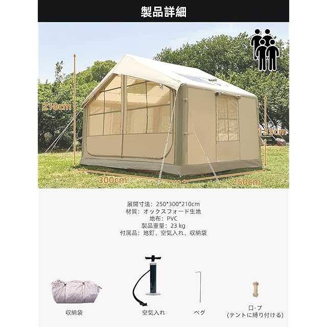 【製品詳細】設営時サイズ:300×250×210cm ;重量:約23kg;柱部分:PVC(ポリ塩化ビニル);生地:420D高密度オックスフォード
