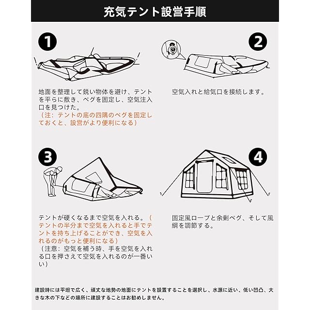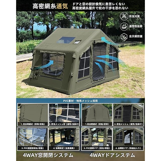 【耐久性に優れた良質な素材】テントの生地は通気性のTC素材(ポリエステル65%と綿35%の混紡生地)を採用し、優れた通気性と難燃性を持ち、夏はムレにくく、冬は寒さを感じません。 底部にはPVCクリップメッシュを採用。 空気入れ柱は大径気柱を採用し、PVC材質で、耐磨耗で刺されにくい。