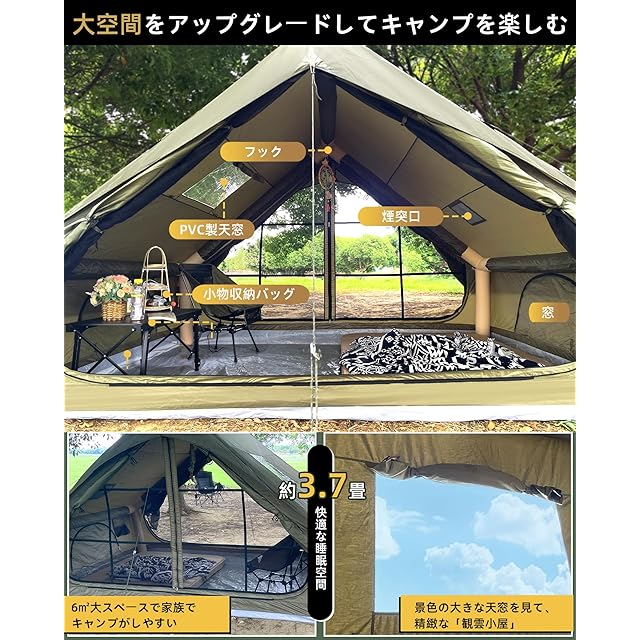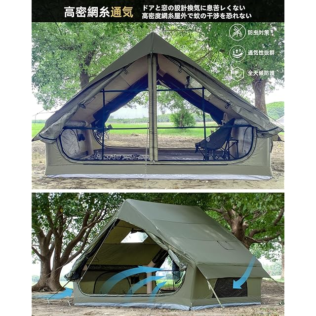 【簡単かつ迅速に設営】インフレータブルテントは、一体型のエアポール支柱構造を採用し、ポンプを接続するだけで簡単に設営が可能な簡単設営テントです。女性でも手軽に5分以内で設営できるため、キャンプ用テントとして非常に便利です。また、このファミリーテントはエアバルブを開けると「カチッ」という音がして、空気を抜いたらコンパクトに折りたためます。注意: 設営前にエアバルブをしっかり締めてください。そうでないとエアポールテントが支えられません。また、エアポールを過度に膨らませないように注意してください。
