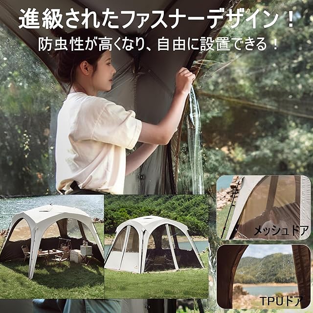 【強大な性能、どんな天気でも楽々】テント本体は150Dオックス生地を採用しており、表面には撥水層が施され、PU防水層に加え、耐水圧5000m+に達して防水性能が342kpaになり、突然の大雨にも対応が可能です。中心はTi BLACK素材を採用し、遮熱率は37%があり、99.9%の紫外線と光、赤外線が阻隔できて皮膚を保護し、UPFが12515.65に達しました!。暑い日にも、テントの中は15℃を保て。また、sundoux色糸を使用し、防引き裂き性能が強くてもっと耐久です。長く使用しても性能が減りません!キャンプ熱狂者のマストアイテムです。