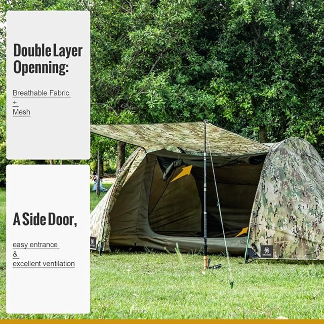 ★[商品仕様] このテントのアウターシェルはアメリカ輸入 70D カモフラージュ ナイロン素材を採用しており、防水性能はPU3000mmの基準を満たし、雨水の浸透を効果的に防ぐことができます。 インナーシェルは20Dの透気性のあるナイロン布と40Dのナイロンメッシュ生地で作られており、室内の換気を促進し、同時に蚊などの虫の侵入を防ぎます。 底面には150Dのオックスフォード生地を使用し、PU3000mmの防水処理が施されています。ジッパー部分には耐久性に優れるYKKブランドを使用しています。 展開時のサイズは、長さ420cm x 幅215cm x 高さ130cmで、パッケージサイズは50cm x 20cm x 20cmで、持ち運びに便利です。テントには14本のペグ、6本のガイロープ、 および1セットの7001アルミニウム合金テントポール(フロントキャビンのポールを含まない)が付属しており、さまざまなアウトドア活動に適しています。
