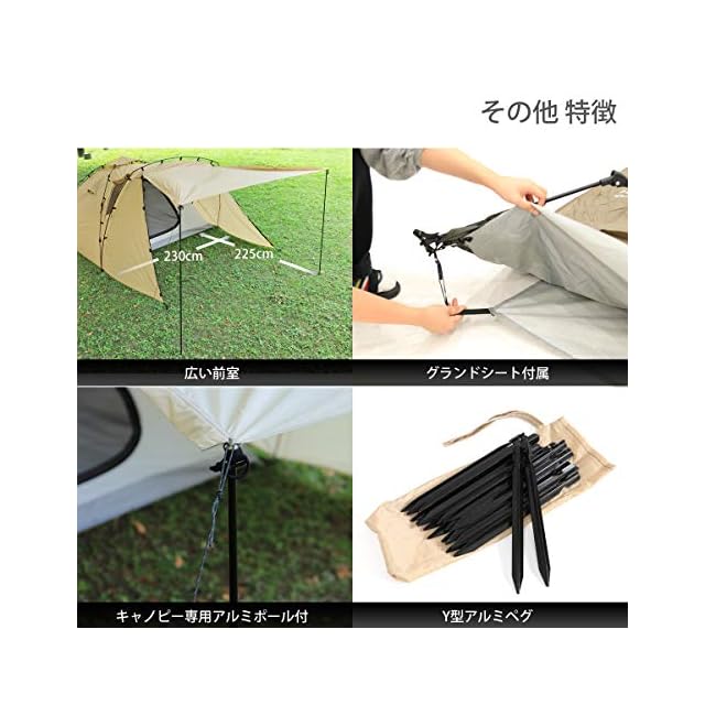材質:アウターテント: 75Dポリエステル(PUコーティング)、インナーテント:ポリエステル通気性生地、フロア: 210Dポリステル(PUコーティング)、ポール:アルミ合金