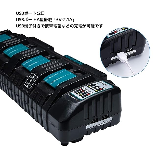 4個同時充電・作業効率UP: 4個の充電口にバッテリーをセットすることで4個同時に充電ができます。多数のバッテリーを利用する現場に便利です。また、充電できるバッテリーの組み合わせは自由です。充電時間目安(BL1860B)実用充電(80%以上まで)→約27分。満充電(100%)→約40分。環境により、異なります。