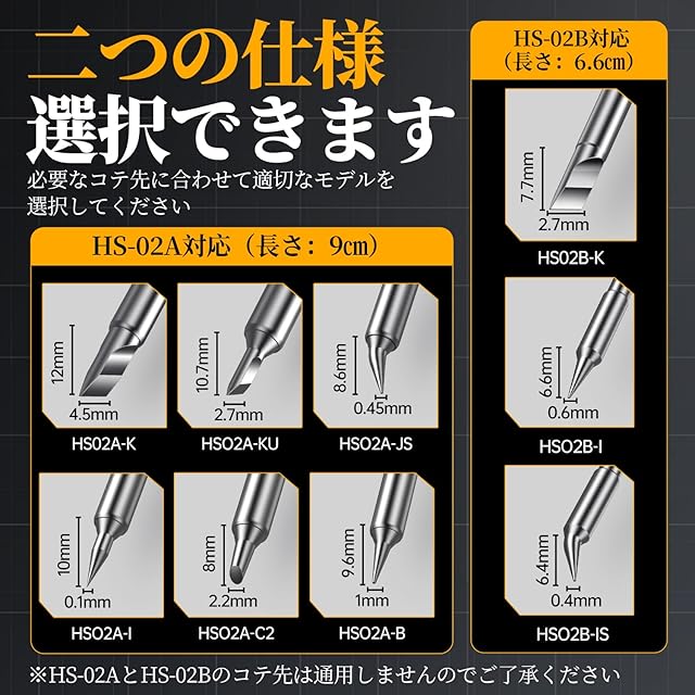 <b> 選べる二択</b><br> モテル HS-02A/HS-02B<br> 電圧 9~20V<br> 温度範囲 100℃~450℃<br> 画面表示 0.96インチIPS高解像度ディスプレイ<br> 重量 ≈61g<br> 給電ポート Type-C<br> 急速充電プロトコル PD/QC対応<br> パワー 100W(Max)<br> 対応するコテ先 HS-02A-XX/HS-02B-XX<br>