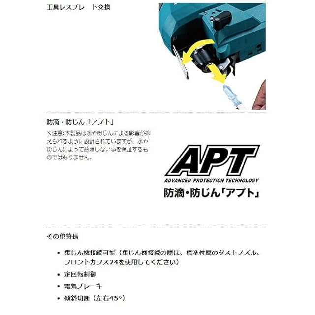オービタル調整レバー。オービタル3段+ストレート切替。スピード調整ダイヤル。5段階切替。工具レスブレード交換。直流18V、スライド式Li-ionバッテリ仕様。バッテリ・充電器付き