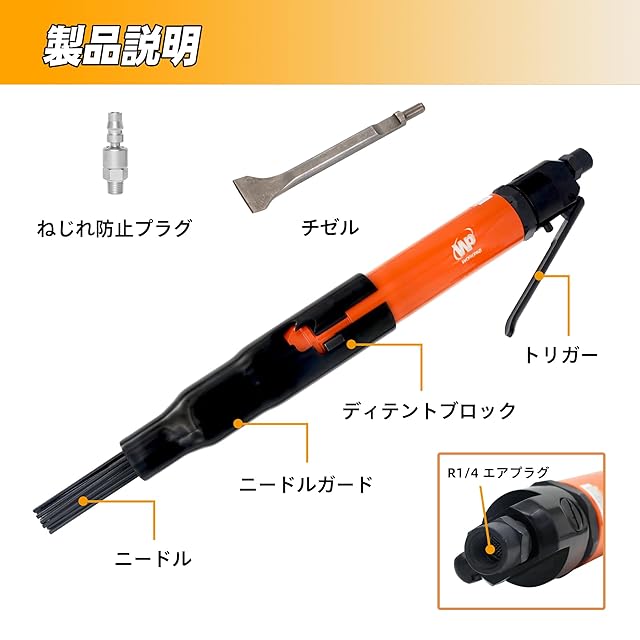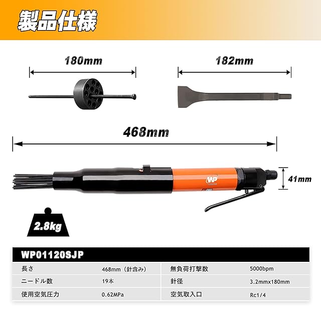 【仕様】サイズ:468mm(針含み)・重量:2.8kg・ニードル数:19本・針サイズ:3.2mm(直径)x180mm(長さ)・ 無負荷打撃数:5000bpm・使用空気圧力:0.62MPa・空気取入口:Rc1/4 【付属品】チゼル×1、1/4カプラ×1、ねじれ防止プラグ×1、シールテープ×1、取扱説明書×1、アフターサービスカード×1