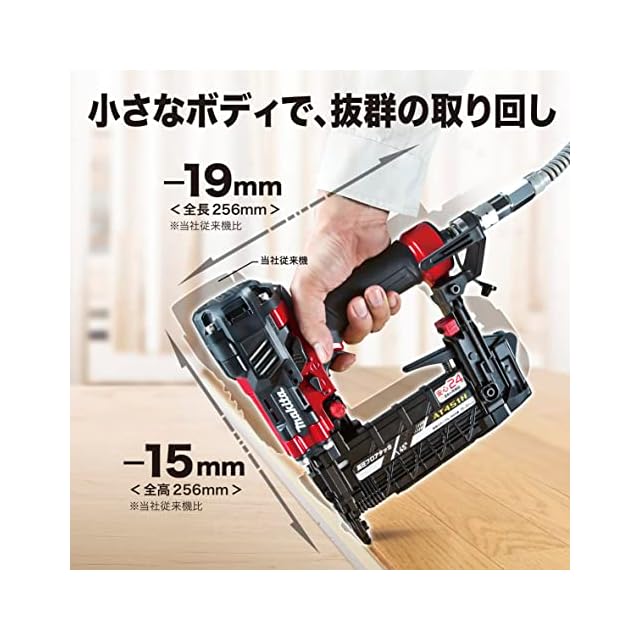 コンパクトボディで抜群の取り回し<br>内部構造を見直し高耐久[安心24]※期間中に取扱説明書の注意事項に従った正常な状態で使用し故障した場合に、書の記載内容に基づき無償いたします。<br>隅打ちしやすい先端形状<br>使用空気圧力:1.18~2.26(MPa)<br>4MA線フローリングステープル:25〜50mm<br>プラスチックケース付<br>本機寸法:256×72×256mm(長さ×幅×高さ)<br>質量:1.5kg