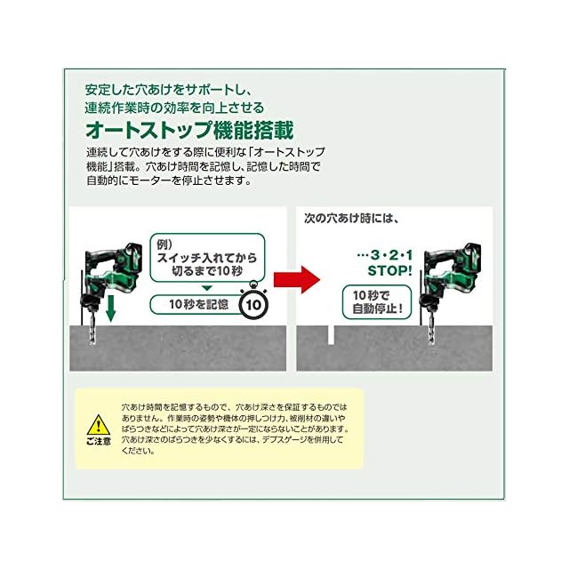 連続して穴あけをする際に便利な「オートストップ機能」搭載。穴あけ時間を記憶し、記憶した時間で自動的にモーターを停止させます。