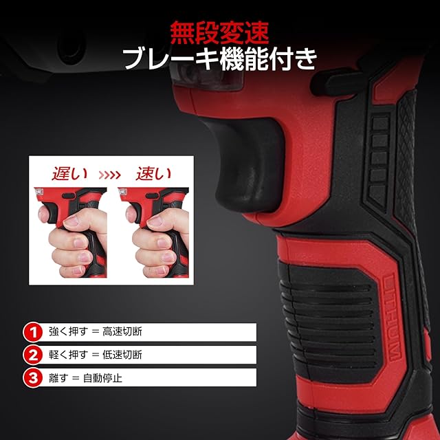 【無段階変速&ブレーキ機能】作業内容に応じてトリガーを軽く押せば低速、強く押せば高速回転に変化するステップレススピード制御を採用。離せば自動停止するブレーキ機能付きで、安全性も大幅に向上。長時間の作業でも手が疲れにくく、初心者でも安心して扱える電動グラインダー・充電式ハサミです。
