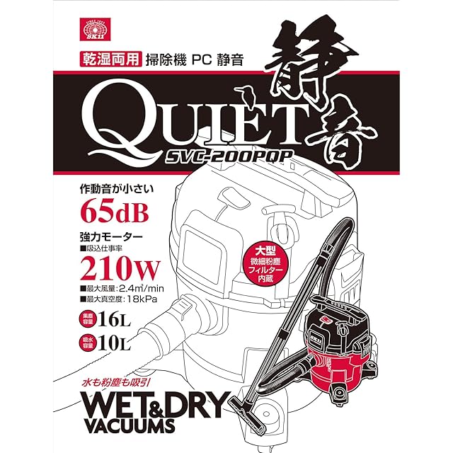 SK11(エスケー11) 乾湿両用掃除機 PC(樹脂)製タンク 静音約65dB 吸塵16L/吸水10L 吸込仕事率210Wの強力モーター 38mm太径ホース SVC-200PQP