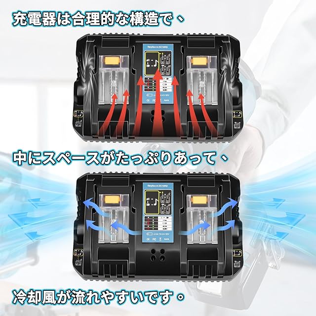 【DC18RD商品仕様】2口充電器 入力電圧:100V-240V 入力周波数:50ー60Hz 出力電圧:14.4v-18v USB端口×2個付き小型 軽量化 スライド式 2口充電器でマキタバッテリーを2個同時に充電可能、作業の中断を減らし、連続使用環境での生産性を大幅に向上させます。