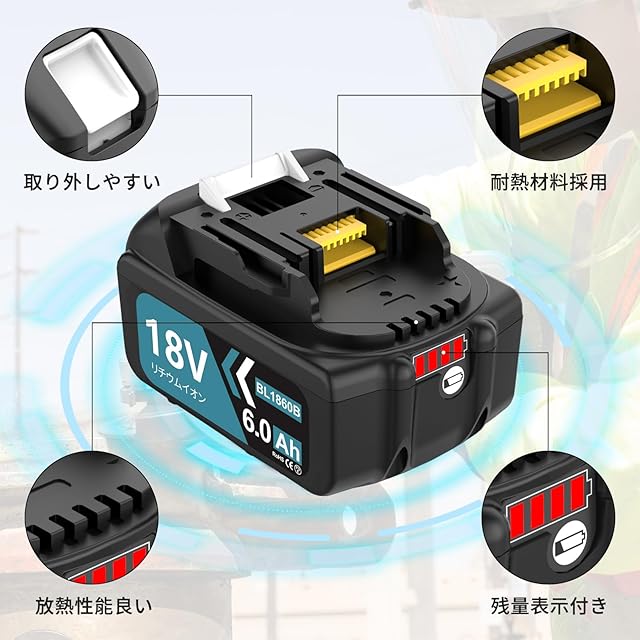 【BL1860B 高品質】18v 6000mAh 超高容量。頻繁に充電する必要ないです。現場で作業すれば大変便利です。ダブル新機能付き:残量表示+自己故障診断。電池サプライヤーとして、当店で提供している製品はすべてメーカーの元包装で、中間業者が差額を稼いでおらず、価格で絶対的な優位を占めており、できるだけお客様のためにより満足な購入機会を目指しています。