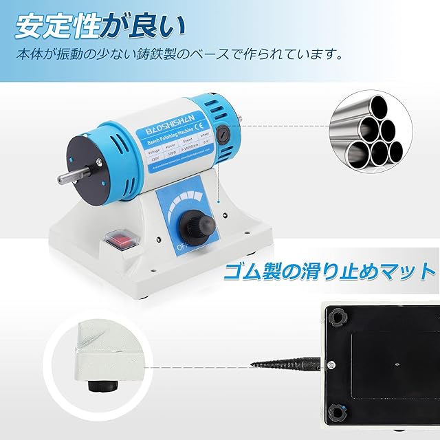 「振動なしで安定性が良い」振動の少ない鋳鉄製のベースで作られだけでなく、ベースで4つのゴム製の滑り止めマットもあり、使用時の研磨作業からの振動による損傷を有効的に回避します。