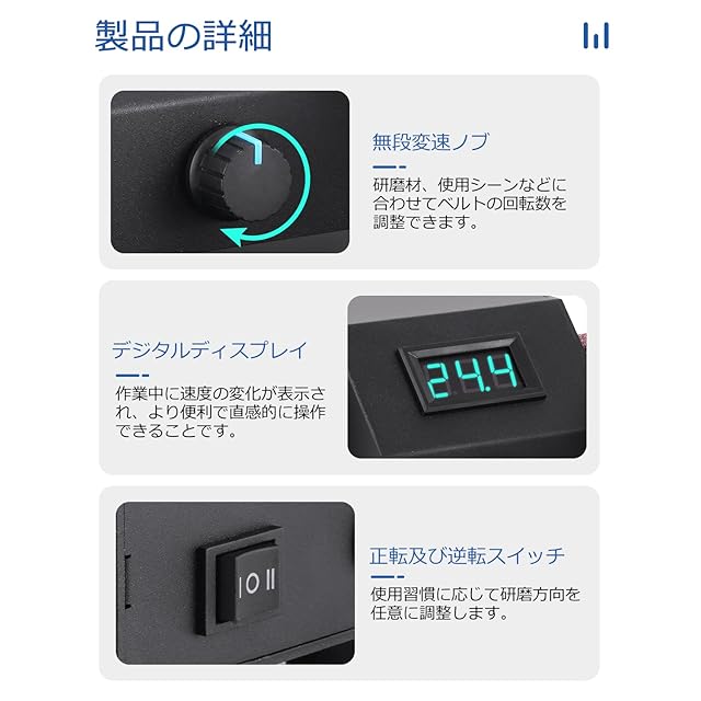 【正転及び逆転可能】ベルトサンダー機が正転及び逆転可能スイッチを持って、使用習慣に応じて研磨方向を任意に調整します。