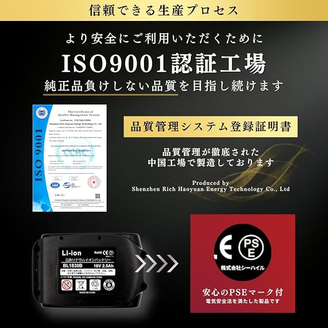 【仕様】 型番:マキタ 互換バッテリー BL1830B 電圧:18V 容量:2.5Ah(2500mAh) 重量 : 約370g 種類:リチウムイオン電池 認証:PSEマーク取得済 保護機能:過電流、過充電、過放電(各セル監視) :1年間(使用頻度による劣化につきましては対象外となります)