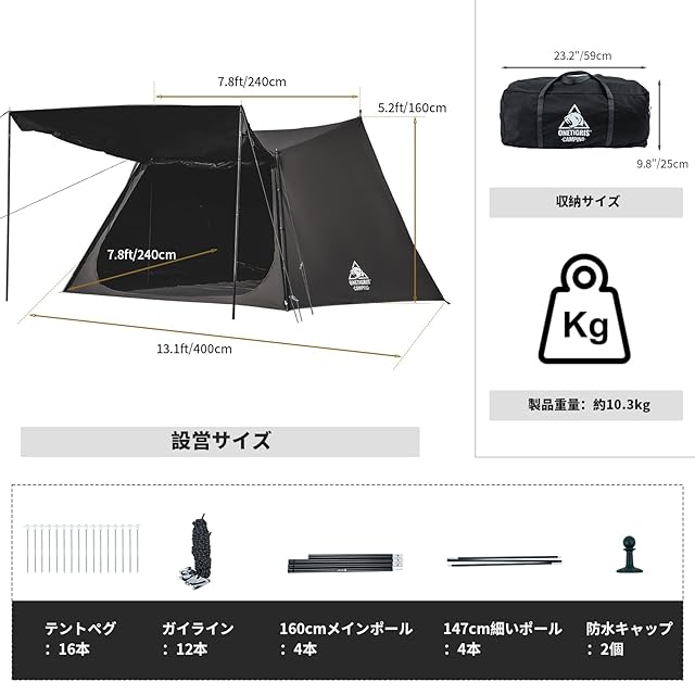 ★【幅広く活躍】キャンプ、ピクニック、ビーチ、花見、釣り、登山、運動会など様々なシーンで活躍します。【製品仕様】★ 収納サイズ: 約59cm*25cm*25cm セットアップサイズ:約4m(L)*2.4m(W)*1.6m(H)、重量:約11kg、 ★8本のテントポール、16本のテントペグ、12本のガイラインの完全なセットアップキットが付属しています。 フロントとリアのキャノピーを同時に持ち上げるには、 別途購入の125cm/160cmポールセット(2枚入り)が必要です。