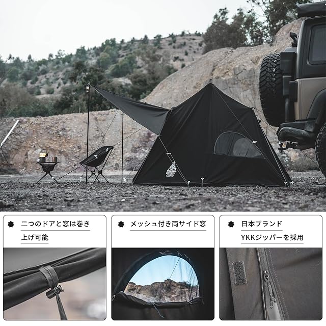 ★【高品質なTCテントと付属品】★クールな外観がなによりの魅力!黒のポリエステル糸とコットン(綿)糸を混紡した生地より作られ、遮光性、難燃性、耐久性を兼ね備えています。★常に信頼のおける日本ブランドのYKKジッパー、スムーズで耐久性に優れています。 またテントのポールは「7075アルミニウム合金」を採用して、軽量でありながら強度が高いです。前室のポールの高さを160cmに変更し、メインポールとしても使えるようにした。