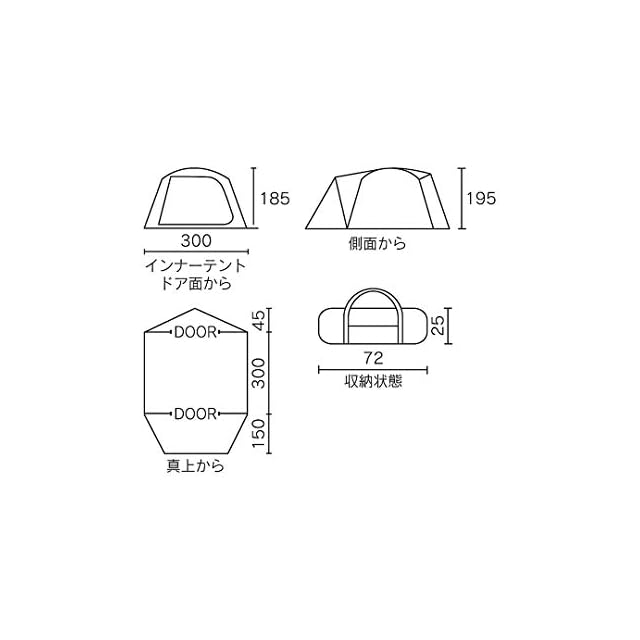【サイズ】テント本体サイズ:約495×300×195(h)cm、テントインナー:約300×300×185(h)cm/収納時:約75×Φ25cm、重量:約11kg [インナーシート]サイズ:約290×290cm(使用時)、重量:約2.3kg、材質:ポリエステル、PUスポンジ [グランドシート]サイズ:約280×280cm(使用時)、重量:約1.6kg、材質:ポリエチレン