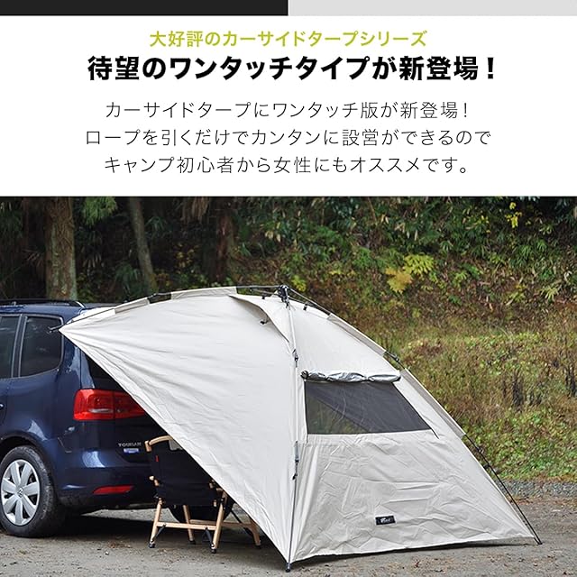 ✅【大好評のカーサイドタープシリーズ 待望のワンタッチタイプが新登場!】 カーサイドタープにワンタッチ版が新登場!ロープを引くだけでカンタンに設営ができるのでキャンプ初心者から女性にもオススメです。 ✅【キャンプ初心者や女子キャンプにも! (約)15秒で簡単に組み立て可能!】 組み立ての所要時間は(約)15秒!タープを広げてロープを引くだけなので女性にも◎設営時間を省きたい方にもピッタリです。