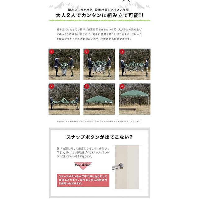 使用上のご注意 【生地の色味について】 生産時期により購入されたシートとテント本体の色味が若干異なっている場合があります。申し訳ありませんが、ご了承の上ご購入をよろしくお願いいたします。 【荒天時使用について】 本テントは耐水加工が施されておりますが、雨天時や風が強い荒天時にはペグで地面に固定しても突風や瞬間的な豪雨などでテントが破損する場合がございますので、使用されませんようお願いします。風・雨などの自然現象による破損につきましてはの対象外となりますのでご注意ください。
