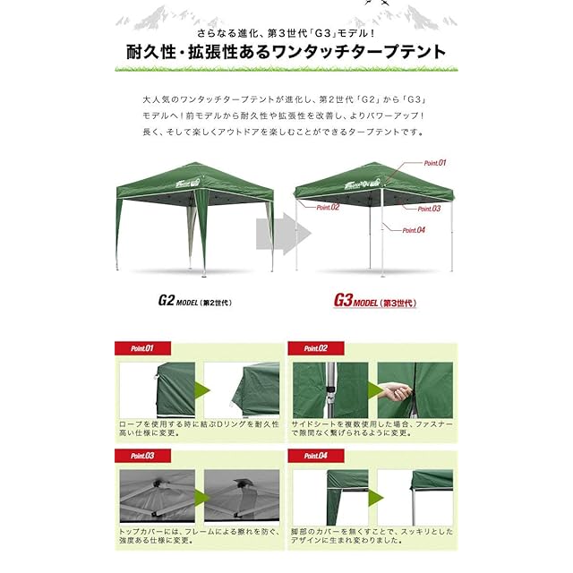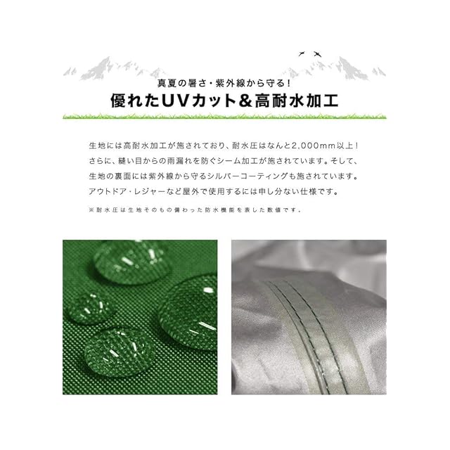 耐水圧 2,000mm以上 付属品 ・ロープ ・ペグ ・専用サイドシート(1枚) ・専用収納ケース ・取扱説明書(日本語・英語)