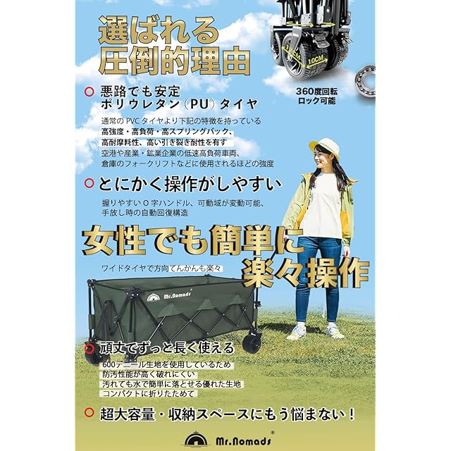 ✅【悪路でも安定するポリウレタンタイヤ】高強度、高スプリングバック、高耐摩耗性、高い引裂き耐性などの特性を有したポリウレタンタイヤを採用。重い荷物をのせて段差のある場所、芝生や凸凹道、ぬかるみ、舗装路、砂利道、砂浜などでも安定して進めます。
