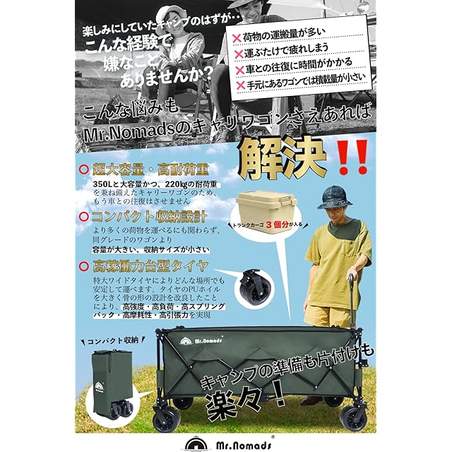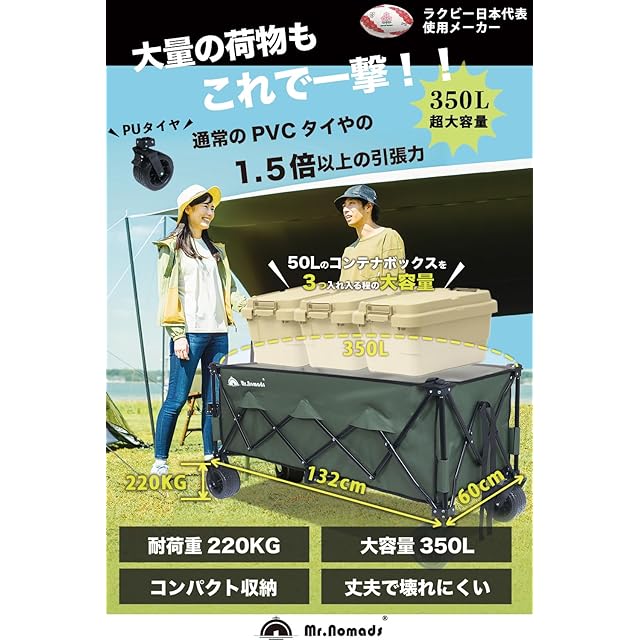 【MR. NOMADS】460L ラグビー日本代表採用メーカー キャリーワゴン 耐荷重220kg 大型タイヤ 自立収納 コンパクト ワンタッチ収束式 折り畳み アウトドアワゴン キャリーカート キャンプカート 建築現場用カート 4輪 キャンプ ( KW003/KW004 シリーズ ) (GS-KW003 Tan リアゲートなし)