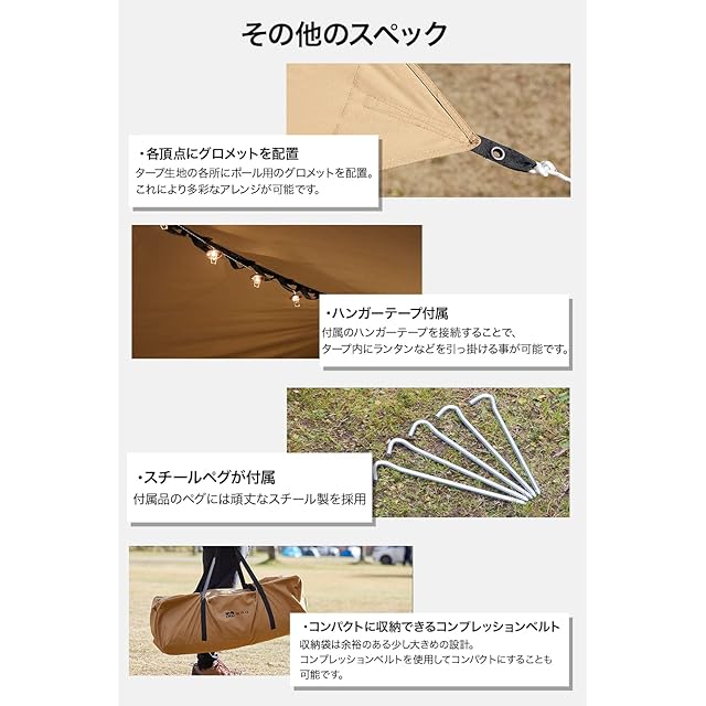 【強度に優れたポールを採用】 どなたでも安心してお使いいただけるよう、重みのあるTC生地をしっかりと支えるための付属のポールは メイン・サブともにアルミではなくスチール製を採用。キャンプ中での天候の変化で強風が吹いてもすぐに倒壊することを防ぎます。 ※悪天候時・強風時は危険ですのでタープの使用はお控えいただき、使用中の場合は即座に撤収してください。 ※Mサイズにサブポールは付属しません。 【その他のスペック】 ・各頂点にグロメットを配置 タープ生地の各所にポール用のグロメットを配置。これにより多彩なアレンジが可能です。 ・ハンガーテープ付属 付属のハンガーテープを接続することでタープ内にランタンなどを引っ掛ける事が可能です。 ・スチールベグが付属 付属品のペグには頑丈なスチール製を採用 ・コンパクトに収納できるコンプレッションベルト 収納袋は余裕のある少し大きめの設計。コンプレッションベルトを使用してコンパクトにすることも可能です。